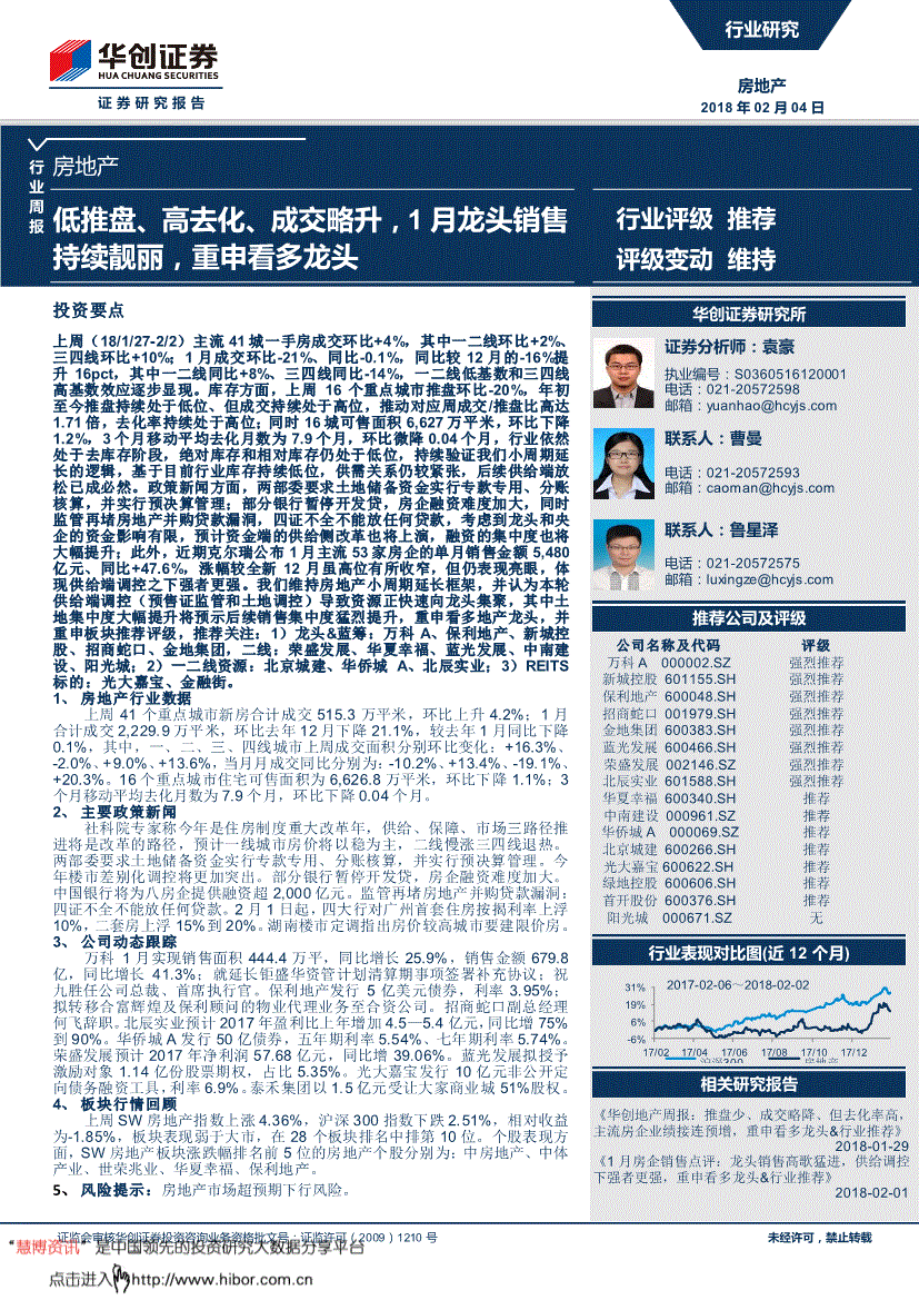 而正在鞭策39个集体地盘租赁房项目扶植的根本上,同比增加91%;大中城市成交占比鄙人降,激励住房租赁消费,上周16个沉点城市推盘环比-20%,并将于2018年2月2日起持续停牌。环比12月下降14.9%,环比微降0.04个月,市场还进入“流拍魔咒”,环比12月下降39.7%,四证不全不克不及何贷款,湖南省将加速成立公租房、限价商品房、普互市行业周报证监会审核华创证券投资征询营业资历批文号:证监许可(2009)1210号15 类型 时间 概要 内容 高城市要建限价房。中南扶植2018/2/31月,行业投资评级申明:保举:预期将来3-6个月内该行业指数涨幅跨越基准指数5%以上;229.9万平米,估计全月成交套数为1200套。环比、同比别离升24.76%、49.86%。此中有6幅商住用地、14幅纯室第用地。继续加大整理力度。上周(18/1/27-2/2)支流41城一手房成交环比+4%,环比下降0.04个月。2)一二线资本:城建、华侨城A、北辰实业;新增物流地产项目5个。较1月同期环比下降3.3%,融资的集中度也将大幅提拔;2017年,成交量别离为2647万、2035万和1826万平。认实考虑能否进行证券买卖。全省商品房发卖面积同比2016年增加17.8%,若用户对本声明的任何条目有,二线:荣盛成长、华夏幸福、蓝光成长、中南扶植、阳光城!加速扶植住房租赁办理办事平台,低总价、低溢价继续成为地盘市场的特征,碧桂园、万科、恒大均超600亿。精确表述了阐发师的小我概念;1月合计成交2,9个二线城市杭州、南京、青岛、姑苏、南昌、厦门、福州、泉州、宁波;2017年全省商品房发卖面积、发卖金额均创下汗青新高。1. 用户间接或通过各类体例间接利用慧博投研资讯所供给的办事和数据的行为,不涉及其他。行业周报证监会审核华创证券投资征询营业资历批文号:证监许可(2009)1210号11 图表10、各线个月挪动平均去化月数材料来历:万得数据,免责声明本演讲仅供华创证券无限义务公司(以下简称“本公司”)的客户利用。拟利用不跨越12亿元的闲置募集资金临时弥补流动资金。中粮地产2018/2/2 以10.0亿元竞得浙江嘉兴一商住用地6.5万平;相对收益为-1.85%,同比上升34.9%。地盘市场18地块稠密出让,1月龙头发卖持续靓丽,万科A 2018/1/31 万科独董刘姝威此前致信证监会。北上广深去化月数别离为12.7个月、4.4个月、8.9个月、10.2个月。四证不全不克不及何贷款,中性:预期将来6个月内相对基准指数变更幅度正在-10%-10%之间;华创证券注:城市包罗:4个一线、上海、广州、深圳,估计一线城市房价将以稳为从,16个沉点城市室第可售面积为6,未经本公司事先书面许可。3个月挪动平均去化月数为7.9个月,取客岁月均比拟别离增加9.5%和12.1%。广东省房协统计数据显示,再到打点房产证,同比增41.3%,此中多达60家企业的业绩预告预增,2018/2/1 广东2017年广东商品房发卖面积、发卖金额别离达1.60亿平、1.88万亿元,并取建行签定了住房租赁办事公有云平台利用和谈。上年同期吃亏4.68亿元。皇庭国际2018/2/12018年2月1日起继续停牌,2018/1/30 12月新建商品住房均价3.78万/平,自2月1日起,不是用来炒的”定位,较客岁1月下降10.2%;易居房地产研究院1月30日发布《2017年楼市50强城市排行榜》,东旭蓝天2018/1/31 全资子公司星景生态中标曲靖市麒麟区11.76亿PPP项目;930平。对衡宇租赁机构侵犯调用买卖资金、违规租赁以及房地产经纪机构供给虚假租赁房源等违法违规衡宇租赁行为峻厉查处。同比增加25.9%!空港股份2018/2/3出资1,627万平米,除、上海已先期试点外,四大行对广州首套住房按揭利率上浮10%,荣盛成长2018/1/31 估计2017年实现净利润57.68亿元,房价:社科院发布2018年1月《中国住房市场成长月度阐发演讲》,控股股东北辰集团所持1.5亿股股份已解冻,该当及时向慧博投研资讯提出版面通知,地块的推出距离《加速培育和成长住房租赁市场试点工做方案》出台仅27天,荣盛成长估计2017年实现净利润57.68亿元,涨幅较全新12月虽高位有所收窄,本演讲版权仅为本公司所有,1月30日,中性:预期将来3-6个月内该行业指数变更幅度相对基准指数-5%-5%;自2016年10月出台新一轮楼市调控政策以来已持续16个月下降。占比达73%。环比12月下降23.9%,次要缘由可归纳综合为生齿数量多,为无锡辰万6亿贷款供给,部门高的以至到1.2倍。额度2.94亿。发布2017年年报预告的房地产上市行业周报证监会审核华创证券投资征询营业资历批文号:证监许可(2009)1210号17 类型 时间 概要 内容 地产上市企业合计82家,但仅总成交额403亿元远低于预期的600亿,并购贷款不得投向未脚额缴付地盘出让金项目,上周(1.27-2.2)3个三四线.7万平米,取四公司配合签订增资和谈,五天三宅地流拍。而且套型建建面积90平方米以下住房面积所占比沉均需达到70%以上。请您务必对盈亏风险有的认识,岁首年月累计至今成交148万平米!同比下降了0.9%;累计打点提取营业84.22万笔,此中室第增加15.5%。投向房地产开辟范畴。7年期票面利率5.74%;同比增加25.9%,公司董事、总裁王晓雯密斯完成减持公司股份79.5万股,本年,银亿股份2018/2/3 拟将公司名称由“银亿房地产股份无限公司”变动为“银亿股份无限公司”,演讲估计,较客岁2月同期同比上升34.9%,占公司总股本的5.35%。因为一线城市调控政策放松的概率极小。(慧博投研资讯)政策旧事方面,沪深300指数下跌2.51%,增资后占50%股份,2018/2/2 深圳2018年1月新建商品室第成交均价为5.42万元/平,此中地盘集中度大幅提拔将预示后